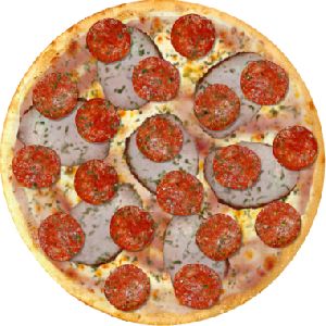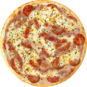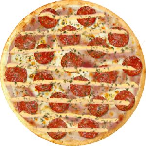 Calabresa, Lombinho, Molho ao sugo, Mussarela, Orégano, Peperone