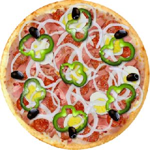 Azeitona preta, Calabresa, Cebola, Molho ao sugo, Mussarela, Orégano, Ovo cozido, Pimentão, Presunto
